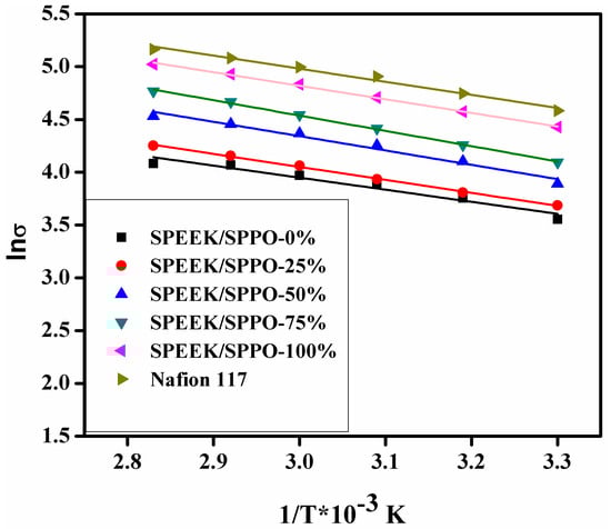 The proton conductivities of the fabricated SPEEK, SPPO, blended SPEEK/SPPO membranes and commercial membrane Nafion 117 as function of temperature were recorded. Higher proton conductivity was observed in case of the fabricated blended membranes than the pristine SPEEK membrane. At 30 °C, the SPEEK, and SPPO membranes showed proton conductivities of 35 mS/cm, and 84 mS/cm, respectively. Contrary the fabricated blended membranes SPEEK/SPPO-25%, SPEEK/SPPO-50% and SPEEK/SPPO-75% represented proton conductivities of 40 mS/cm, 49 mS/cm and 60 mS/cm, respectively, at 30 °C. It was observed that by increasing the amount of SPPO into the polymer matrix, the proton conductivity was affected positively. It was due to increase in hydrophilicity of the prepared blended SPEEK/SPPO membranes. The value of proton conductivity for SPPO membrane was found to be similar to the already reported one in our previous work []. However, the obtained values of proton conductivities for the blended membranes were lower than commercial membrane Nafion 117 (98 mS/cm) at 30 °C, but these values of proton conductivities for the prepared blended membranes SPEEK/SPPO were notably higher and enough for development of fuel cell. Furthermore, the proton conductivity of the fabricated membranes appeared to be directly proportional to the temperature due to acceleration in mobility of proton. The further investigation of mechanism in the blended SPEEK/SPPO membranes was carried out by determining the activation energy values for proton conductivity as derived by the linear fitting of data as shown in Figure 6 by using Arrhenius type equation and the attained values of activation energy are given in Table 3.