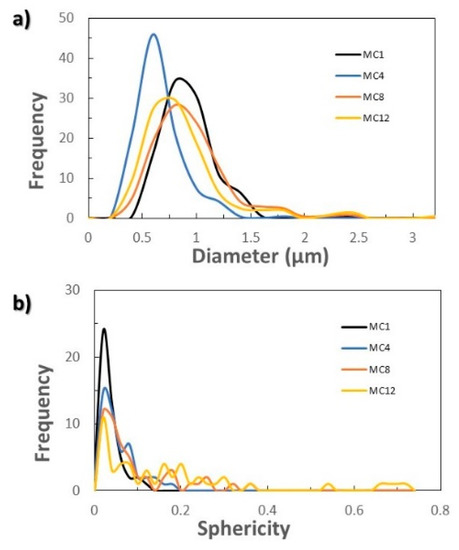 The shape of the MCs was determined using the sphericity factor (S.F.) [27,28], calculated from the following formula (Equation (1)):