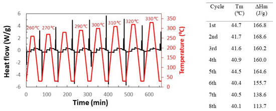 SEM images also saw that the aspect of MCs did not vary when they were subjected to 260 °C. However, it is still needed to check that the n-eicosane remains in the capsules. For this purpose, by using DSC, a sample of MCs was subjected to a series of heating-cooling cycles (see Figure 7). The first cycle was heated up to 260 °C, and each subsequent cycle was heated to 10 °C more than the previous one, up to 330 °C. It can also be seen that the latent heat of fusion does not decrease until it exceeds 300 °C, which corresponds to cycle 5.
