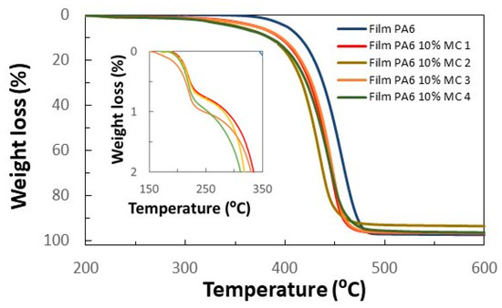 TGA of PA6 film made at 256 °C and 50 bar without MCs and four samples with 10 wt.% MF/n-eicosane MCs. Four different areas of the membrane were considered (MC 1 to MC 4).