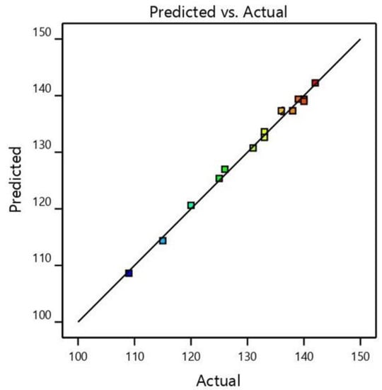 A diagnostic plot such as the predicted versus actual values shown in Figure 2 supports adjudicating the model satisfactoriness visually. Figure 2 indicated a satisfactory agreement between actual data and those obtained from the models. A model typically can be considered reproducible if its coefficient of variance (CV) is less than 10%. The quadratic model represents a CV value of 0.8978%, indicating good reproducibility of the model (Table 6).