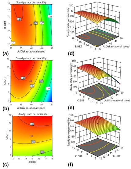 Figure 3b,e show the 2-D contour and 3-D response surface plots between disk rotation and SRT, depicting that higher disk rotational speed from 30 to 40 rpm at SRT values from 10 to 15 days led to higher permeability, while beyond 40 rpm, the permeability gradually decreased. Shorter SRT resulted in poor settling of sludge, which increased the filtration resistance by blocking the membrane pores []. Higher SRT facilitated retention of the microbial community for a longer time in the bioreactor and thus lowered sludge production.
