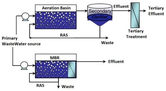 The introduction of membrane bioreactors (MBRs) as a treatment technology has given rise to reduced plant foot print through the elimination of processes such as secondary clarification, tertiary filtration and UV disinfection and works with low feed to microorganism ratio [83,84]. Other advantages of MBRs include good disinfection capability, high quality effluent, good organic and inorganic separation ability, high organic loading resisting capability, absolute control for a longer sludge retention time (SRT) and shorter hydraulic retention time (HRT), and low sludge production rate due to negligible settleability [85,86,87]. Having a longer SRT allows slow-growing microorganisms responsible for the degradation of most nitrogen-based compounds to develop. Over the years, MBRs have been used to effectively treat industrial and municipal wastewater at mixed liquor suspended solids (MLSS) levels up to 12 mg/L, a level that CAS can only handle a minor fraction [88]. Despite treatment reliability of MBRs, they are associated with high operational and capital costs, membrane fouling phenomena, and high energy demand [89]. A visual comparison of CAS and MBR is shown in Figure 2.