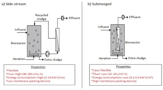 Schematic diagram of (a) side stream MBR and (b) submerged MBR.