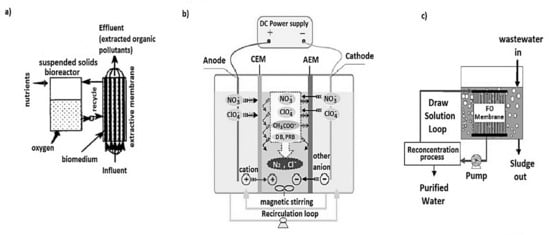 (a) Extractive membrane reactor; (b) Electro-dialysis ion exchange membrane bioreactor; (c) Osmotic bioreactor adapted from [109,110].