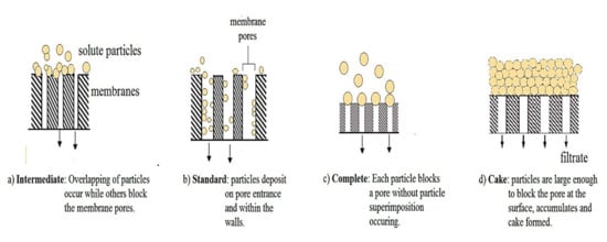 Generally, fouling mechanism in MBRs involve adsorption and accumulative deposition of foulants on the surface of the membrane, and precipitation in pore blocking. The surface adsorption, mechanism and accumulative deposition results in reversible fouling while irreversible fouling is attributed to the deposition in the membrane micro pores. Clogging of the pores is dependent on the size and shape of the particle, and the pore and pore size distribution of the membrane. Figure 6 is a schematic view of the different pore blocking mechanisms. The blocking index (n) of intermediate blocking, standard blocking, complete blocking, and cake formation are 1, 1.5, 2, and 0, respectively. The rate of fouling is higher in anaerobic MBRs than under aerobic conditions.