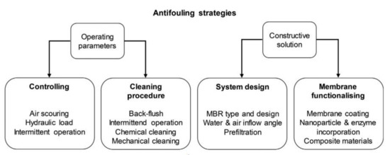 Strategies to control membrane fouling includes the pretreatment of the feed, optimization of operational conditions, activated sludge modification, membrane design and surface modification, and membrane cleaning. Generally, the antifouling and cleaning activities undertaken to recover the initial permeate flux is determined by the fouling and membrane type used. These strategies are equally major energy enhancing strategies as attempts are made to reduce the overall energy consumption in MBRs. The cost of these activities is also inevitable as membrane permeability maintenance has the most significant impact on operational expenditure [132]. As such, one antifouling technique is the introduction of air flow directly to the membrane surface through additional diffusers below the membrane module. Aeration as a control strategy is a main energy consumer of MBR systems with a percentage of 36–68% [137]. An overview of existing and innovative antifouling strategies for MBRs are illustrated in Figure 7.