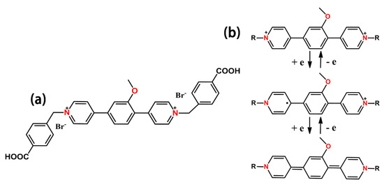Electron−deficient 1,1′−disubstituted−4,4′−bipyridinium derivatives (viologens) are known for their capability of distinct optical displays. With the assistance of appropriate electron donors, they can undergo reversible redox reaction via electron transfer (ET) and exhibit three redox states (dication (V2+), radical cation (V+) and neutral (V0)), which results in the change of optical properties [14,15]. Due to these special capabilities, viologen derivatives can be used as photo/electro−responsive materials. However, most viologen derivatives are electro−responsive but non−photoresponsive. The coordination polymers (CPs) constructed from metal clusters and organic ligands could provide cooperation between components and the inter−contact structural framework, which can create effective channels for ET, allowing for the transition of viologen units between different redox states under stimuli [16,17,18,19,20]. As a consequence, taking advantage of the great versatility afforded by coordination chemistry, nonphoto−responsive viologen ligands may not only result in photo−responsiveness, but could also integrate photochemical and electrochemical functionalities [20,21]. The viologen derivatives, which consist of two pyridinium rings spaced by conjugating aryl groups, named “extended viologen” (ExV), display similar redox features to the viologen units [20]. According to previous studies, the ExV could afford new fluorescence properties [22]. Therefore, ExV−based CPs are expected to realize the coupling of electro/photo−chromism with fluorescence properties. Viologens are typical organic EC materials with a dramatic optical contrast and have been widely explored. However, viologens are common solution−type EC materials, which cannot be bleached by applying a reverse voltage but only by write−erase effect, resulting in a long bleaching time [23,24]. Viologen−based CPs can be film−forming as a way of solving this problem. Moreover, CPs possess tunable redox−active sites, surface areas and compositions, which are favorable factors as EC materials [25,26]. Therefore, viologen−based CPs are promising EC materials, but their EC properties have rarely been investigated.