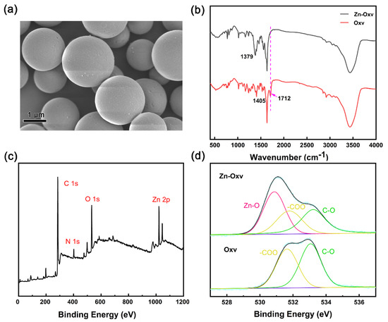 (a) The SEM image of Zn−Oxv. (b) FTIR spectra of the Zn−Oxv compound and free ligand (Oxv). (c) Broad XPS spectrum of the Zn−Oxv compound. (d) High−resolution XPS spectra of O 1s for Zn−Oxv.