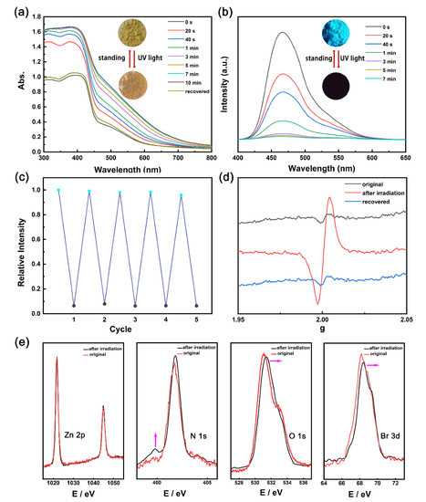 (a) Solid−state UV−vis spectra show the photochromic behavior of the Zn−Oxv compound. The inset shows the color change of Zn−Oxv powder. (b) The emission spectra of the Zn−Oxv compound changed during UV light illumination. The inset shows disappearance of visible emission. (c) Five cycles of fluorescence on−off switching at λ = 467 nm. The emission intensity of recovery state (blue point) and stimulated state (black point). (d) ESR spectra for the Zn−Oxv compound before, after irradiation and recovered in the solid state at room temperature. (e) High−resolution XPS spectra of Zn 2p, N 1s, O 1s and Br 3d for the Zn−Oxv compound before and after irradiation.