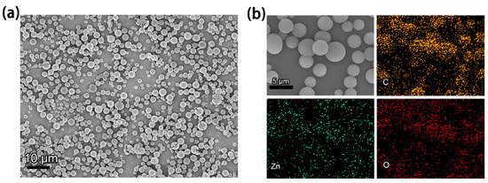 Zn−Oxv CPs were synthesized via a hydrothermal method; the SEM image showed a regular spherical morphology of Zn−Oxv (Figure 2a). For the FTIR spectra of Zn−Oxv (Figure 2b), the strong absorption bands, which correspond to the vibration of the phenyl ring observed, confirm the presence of the Oxv ligand [27]. Additionally, for the stretching vibration of carbonyl, the representative absorption band around 1700 cm−1 disappeared; the absorption band around 1400 cm−1 exhibited a bathochromic effect, indicating the coordination interaction between the zinc center and the carboxyl group in the Zn−Oxv [28,29]. XPS measurements were carried out to examine the element compositions and to record the valence state changes in the desired Zn−Oxv CPs; the survey spectrum is exhibited in Figure 2c. The high−resolution spectrum of O 1s can be deconvoluted into peaks at 530.8, 531.8 and 533.2 eV, shown in Figure 2d, which can be assigned to Zn−O, −COO and C−O [30,31]. In comparison with O 1s of the Oxv ligand, the presence of the Zn−O bond in Zn−Oxv CPs further confirms the coordination interaction. The characteristic binding energy of Zn 2p3/2 and 2p1/2 is observed at 1021.9 and 1045.0 eV (Figure S8), respectively, which is consistent with the coordination environment of the zinc and the oxygen atoms [31]. The thermal stability of Zn−Oxv was proven by thermogravimetric analysis. The collapse of the whole structure happened when the temperature reached 260 °C, as shown in Figure S9. All characterization results showed successful fabrication of Zn−Oxv CPs.
