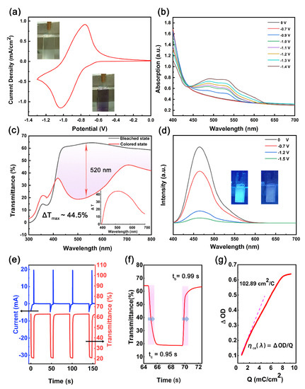 - Shi, Y.; Liu, J.; Li, M.; Zheng, J.; Xu, C. Novel electrochromic−fluorescent bi−functional devices based on aromatic viologen derivates. Electrochim. Acta 2018, 285, 415–423. [Google Scholar] [CrossRef]