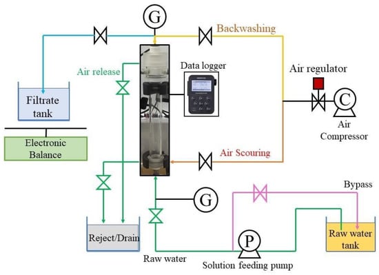 Schematic diagram of membrane filtration experiments. Notations: C denotes air compressor; G denotes digital pressure gauge; and P denotes pump. (Modified from “Operation Procedures for Laboratory Outside-in Filtration Test”, obtained via private communication with Kuraray Co., Ltd., Tokyo, Japan).
