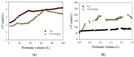 The previous study shows that fouling depends on hydrodynamic conditions and foulant properties [2,20,22]. The cake filtration was distinguished from other fouling mechanisms by plotting t/V versus V (see Figure 2), where a linear relationship identifies cake filtration as the dominant fouling mechanism [22,23]. TA filtration with the MF membrane shows a curve from the initial phase up to about 50 L filtrate volume, indicating pore-clogging processes by low molecular weight TA. In the presence of iron oxide (TA + Fe2O3), t/V was linearly correlated with V from a filtrate volume of about 35 L, indicating that the fouling mode shifted to cake filtration. Thereafter, a decrease in t/V with increasing V was observed, probably caused by air scouring during filtration, which peeled off the loose cake of iron oxide.