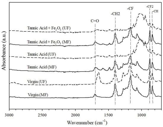ATR-FTIR spectroscopy was used to study the chemical properties of the fouled membranes, as shown in Figure 3. The characteristic peaks of the virgin UF membranes at wavenumbers of 1180 cm−1 [25], 1234 cm−1 [26], and 1275 cm−1 [27], which represent the -CF out-of-plane stretching [28], disappeared from the spectra of the TA-filtered and TA -Fe2O3-filtered UF membranes. This phenomenon was not observed for MF membranes, suggesting that organic impurities cover the surface of the UF membrane more than that of the MF membrane. This was also confirmed by the appearance of a peak at 1000–1100 cm−1 for only the UF membranes. In addition, the carbonyl group (i.e., C=O), which may be derived from a hydrophilic additive of PVP, was observed on both virgin and fouled MF membranes. The carbonyl group, which is derived from PEG, and the methylene group (i.e., -CH2) on virgin UF membrane disappeared from the spectra of the fouled UF membrane (Figure 3), suggesting surface coverage by fouling materials.