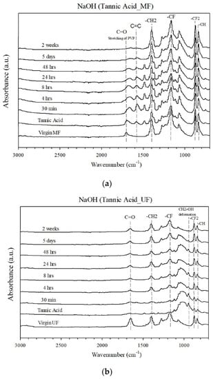 FTIR spectra of virgin and fouled (a) MF and (b) UF membranes filtrated with the tannic acid solution after soaking in NaOH at different periods from 30 min to 2 weeks.