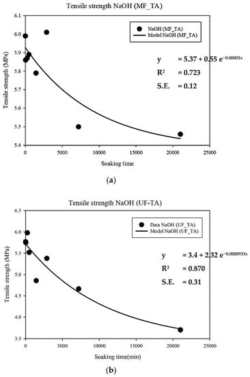 Tensile strength of (a) MF and (b) UF membranes filtrated with TA after soaking in NaOH solution. Fitting performed by exponential equations. S.E. stands for standard error.