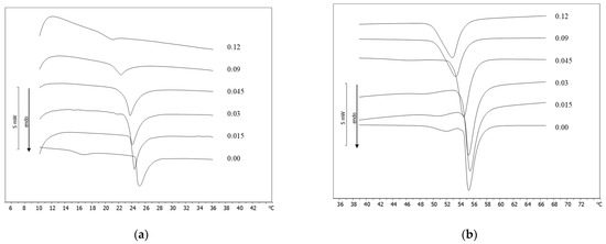 (a) Calorimetric curves, in heating mode, of DMPC MLV prepared with increasing molar fractions of PCAEE; (b) Calorimetric curves, in heating mode, of DSPC MLV prepared with increasing molar fractions of PCAEE.