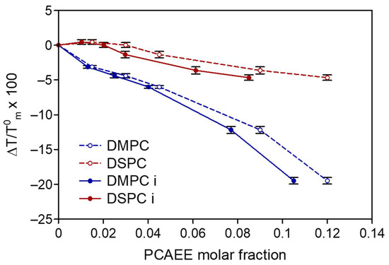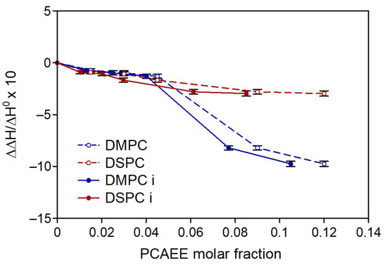 In Figure 3, the ΔH variations are reported as ΔΔH/ H0 (ΔΔH = ΔH − ΔH0, where ΔH0 is the enthalpy variation of MLV prepared without compound, and ΔH is the enthalpy variation of MLV prepared in the presence of each compound) as a function of the compound molar fraction present in the MLV samples. The dotted lines represent the effect of PCAEE present in the MLV aqueous dispersion, whereas the continuous lines represent the effect of PCAEE present in MLV bilayers. For both DMPC MLV and DSPC MLV, PCAEE causes a decrease of the ΔH. However, the decrease is more evident for DMPC MLV. If the compound is considered as an impurity dissolved in an ideal, two-dimensional solution, the lowering of the lipid bilayer transition temperature can be rationalized in terms of van’t Hoff’s depressing of freezing temperatures [22,31]. In this case, one should observe an almost linear decrease of the bilayer transition temperature with the concentration of the foreign molecule in the bilayer, while the associated enthalpy should remain constant. With regard to the temperature variation, this behaviour has been observed in Figure 2, which shows that the transition temperature decreases with the concentration of PCAEE. In Figure 3 where the enthalpy data (expressed as ΔΔH/H0) is presented, we observe a sharp decrease of the transition enthalpy only in the case of DMPC, while the enthalpy decrease is much smaller for DSPC. This behaviour indicates that the presence of PCAEE exerts a destabilization of lipid–lipid interactions. The strong interaction of PCAEE with the lipid chain prevents the highly cooperative melting of the lipid tails, causing the gel-to-fluid-phase transition of the bilayer to be less endothermic and less cooperative. As a result, the intensity of the calorimetric peak decreases, and the peak shape broadens.