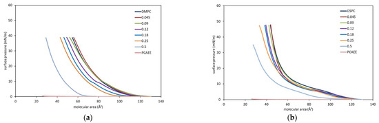 Regarding DMPC, PCAEE caused at all the molar fractions a positive deviation that becomes less evident at 30 mN/m; this behaviour indicates the expansion of the monolayer and suggests that the PCAEE drug incorporates into the phospholipid monolayer. This behaviour could seem surprising because PCAEE is enabled to form a monolayer, and hence, it could dissolve in the subphase. However, other researchers [34] have found that monolayers containing both soluble and insoluble molecules may form despite the monolayer containing a soluble species (Figure 5a).