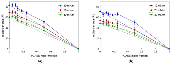 Important information can be found by reporting, at different surface pressures, the mean molecular area as a function of the molar fraction of PCAEE present in the monolayer (Figure 5). The mean molecular area of a two-component monolayer is calculated by A = A1X1 + (1 − X1)A2, where A is the mean molecular area, X1 is the molar fraction of component 1, and A1 and A2 are the areas of the two pure components (phospholipids and PCAEE in this case) at the same surface pressure. Reporting in graph A as a function of X1, a straight line is obtained when the monolayer components are completely immiscible or possess an ideal miscibility [32,33]. Deviations from the straight line give indication on the interaction between the molecules. Positive deviation is an indication that repulsive interactions occur, whereas negative deviation indicates the attractive forces are established between the molecules.