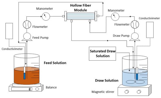 Closed countercurrent recirculation circuits of the feed and extraction solutions were carried out on each side of the FO membrane through two peristaltic pumps. In all experiments, the FS was passed through the lumen side of the hollow fibers (active side), while the DS was passed along the shell side. To calculate the flow of water that crosses from feed to draw and to observe the reduction in volume over time in the experiments, a digital electronic balance was used. In addition, a conductivity meter was inserted into the FS and DS to measure concentration and to evaluate the saline flux. To determine the FS and DS flow rates and the inlet and outlet pressures, a flowmeter and a manometer were placed on each side of the membrane. In all experiments, a saturated solution of draw solution was added and magnetically stirred to keep constant the concentration of the draw solution.