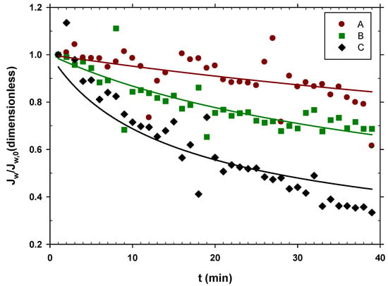 where t is the elapsed time and K is the kinetic constant of the fouling process. The curves in Figure 2 are those that correspond to their fitting to Equation (3) with the resulting parameters shown in Table 2. As expected, the fouling constant K increases as the organic matter content of the WW increases.
