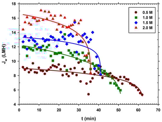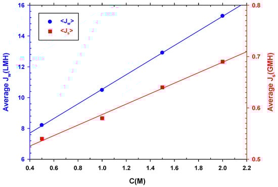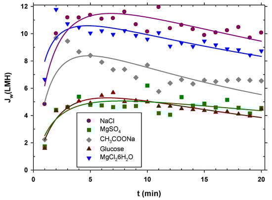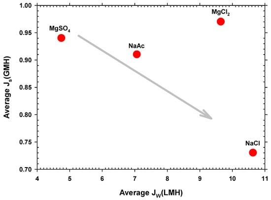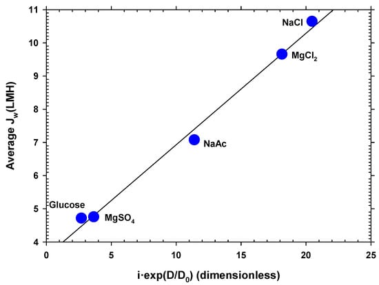where Do is the diffusion coefficient of the least diffusive solute and α is a constant. In Figure 5, it is clearly appreciated that the most appropriate solute is the most diffusive, with factor i close to 2. The values of the Van’t Hoff factors and the diffusion coefficients used for Figure 5 are shown in Table S4 of the Supplementary Materials [,,,]. Magnesium chloride, despite having a value of i close to 3, produces less flux due to its lower diffusion coefficient. Oppositely, magnesium sulfate and glucose, with values of i close to 1 and lower diffusion coefficients, give the lowest fluxes. This correlation can be highly useful as a guideline when selecting a solute to optimize the osmotic driving force in an FO process.