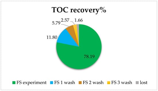 The experiment was carried out by using urban wastewater with pretreatment A as the FS and 0.5 M of NaCl as the DS. The flow rates used are mentioned above in Section 2.2. All measurements were carried out at a pH of around 7. The operation consisted of feeding slightly more than 5 L of urban wastewater previously centrifuged and filtered, until a considerable reduction in the feed volume was achieved of about 87% in 62 min. Samples were collected from the FS at time 0 and from the FS at the end of the experiment and immediately stored in the freezer at −20 °C until analysis.