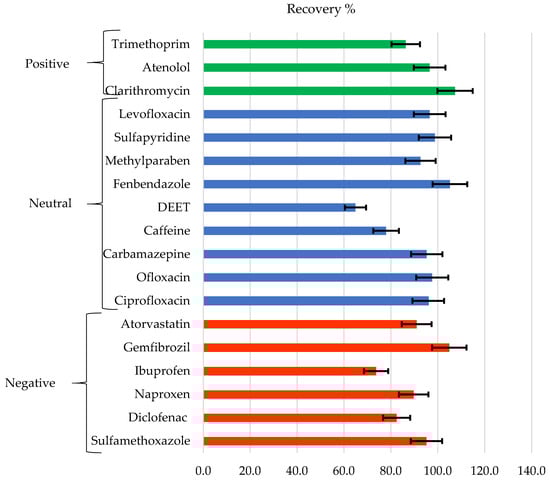 Fifty-one pollutants from the WWTP of the city of Valladolid were studied. The presence of these pollutants in urban wastewater was evaluated, and their concentration in these waters was quantified. In addition, the concentration of these contaminants after passing through the FO membrane was measured, and the membrane’s rejection capacity against each contaminant was evaluated. The total list of the 51 contaminants studied can be found in the Table 1.