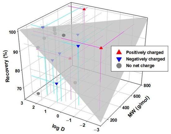 The samples with the emerging contaminants were analyzed directly by Ultra-High-Performance Liquid Chromatography (UHPLC)–tandem Mass Spectrometry (MS/MS) in Selected Reaction Monitoring (SRM) mode by SCIEX Triple Quad™ 6500+ LC System-MS/MS, both from SCIEX (Framingham, Massachusetts, USA) []. The injection volume of the samples was 200 µL, and a matrix-matched calibration curve was necessary for the quantification of the analytes in the samples. The complete list of SRM parameters is provided in the Supplementary materials (Table S2), as well as the Method Limits of Detection (MLD) and Quantitation (MLQ) for each target analyte (Table S3), which was determined according to the lowest concentration from the calibration curve which gave a signal-to-noise ratio (S/N) larger than 3.0 and 10.0, respectively.