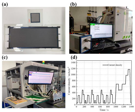 (a) 25 cm2 MEA, and 340 cm2 MEA; (b) Greenlight G20 and Gamry reference 3000; (c) HTS-2000 (HepHas Energy), and 3-cell stack; (d) dynamic load cycle used in 1003-hour durability test.