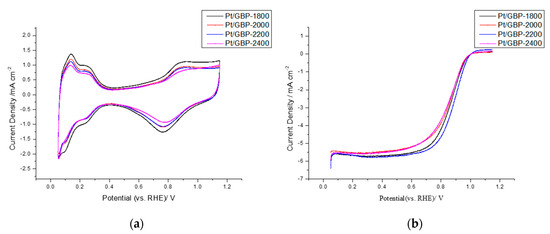 CV and LSV curves of self-made Pt/GBP and commercial catalyst Pt/C were shown in Figure 4a,b. The ECSA of the self-made Pt/GBP catalyst was lower than that of commercial Pt/C, which was related to the graphitization structure of the support. Compared with the amorphous carbon of XC-72, the defect sites on the surface of graphitized carbon supports were reduced, which affected the nucleation and deposition of platinum particles. Moreover, the MA of the Pt/GBP catalyst was slightly higher than that of Pt/C, which indicates that the catalytic activity per unit mass was improved; consequently, the SA of Pt/GBP was significantly higher than that of Pt/C. Detailed performance data of the above two catalysts are listed in Table 4.