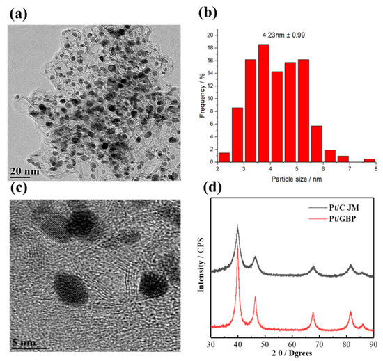 Pt/GBP catalyst: (a) the TEM image, (b) the histogram of particle size distribution, (c) the HRTEM image, and (d) the XRD spectrum compared with Pt/C JM catalyst.