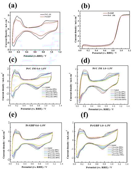 (a,b) Initial CV, LSV curves of Pt/GBP, Pt/C catalyst; (c,d) CV curves of Pt/C during 30 k cycles (0.6–1.0 V) and 10 k cycles of ADT (1.0–1.5 V). (e,f) CV curves of Pt/GBP during 30 k cycles (0.6–1.0 V) and 10 k cycles of ADT (1.0–1.5 V).
