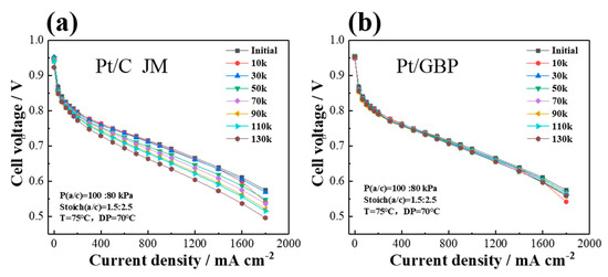 - 0.6–1.0 V cycles test: The changes of the polarization performance of commercial Pt/C-MEA and Pt/GBP-MEA during 130 k cycles of 0.6–1.0 V are shown in Figure 5. The commercial Pt/C-MEA showed a significant performance degradation as shown in Figure 5a, with a voltage loss up to 58 mV@ 1000 mA cm−2, and the performance degradation was more serious at high current density. However, after 130 k cycles of 0.6–1.0 V, the Pt/GBP-MEA in Figure 5b showed almost no performance loss, only 10 mV@1000 mA cm−2. The results indicated that the MEA fabricated with Pt/GBP had stronger potential-cycle resistance in the range of 0.6–1.0 V, and showed better durability than Pt/C;