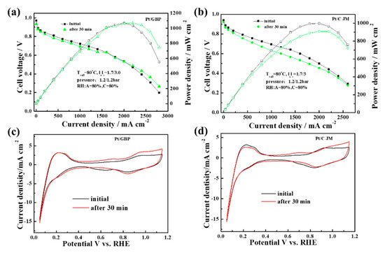 - Anti-high penitential (1.5 V) test: In order to simulate the state of high potential caused by FC stack start-up/shut-down and local reversal, ADT with a high potential of 1.5 V was carried out. The polarization curves and CV curves of MEAs fabricated with Pt/GBP and Pt/C before and after ADT are illustrated in Figure 6. At 1000 mA cm−2, the initial performance for Pt/GBP and Pt/C were 0.724 V and 0.693 V, respectively. After 1800 s of the sustained high-potential scanning of 1.5 V, the voltages of both decreased to 0.695 V and 0.621 V at 1000 mA cm−2, and decay rates were 4% and 10.3%, respectively. In fact, as could be seen from the polarization curves in Figure 6a, the performance of the PGB catalyst was still increasing at high current density. Figure 6c,d showed the comparison of CV curves of single cells before and after ADT. It could be seen that ECSA of Pt/GBP-MEA had almost no change after 1800 s at high potential of 1.5 V, while Pt/C catalyst decreased significantly. The results indicated that the as-prepared Pt/GBP catalyst had excellent resistance and longer lifetime to high potential, implying that high graphitized support had strong corrosion resistance under high-potential conditions;