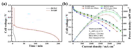 Figure 7. (a) Voltage reversal tests of MEAs fabricated with Pt/C and Pt/GBP and (b) polarization curves of MEAs before and after reversal tolerance test.