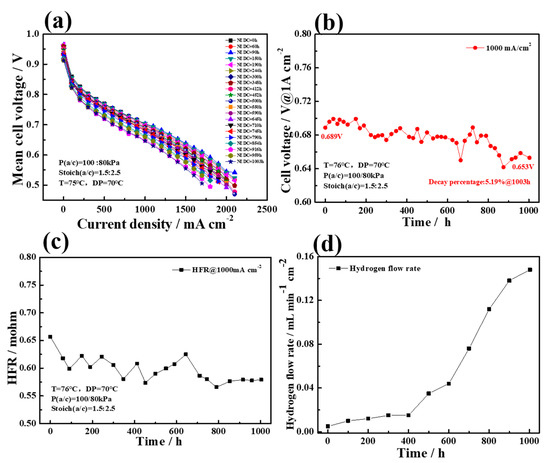 For the purpose of further evaluating the application of the PEMFC stack in practical conditions, the 1003-hour durability test was performed, and the actual driving conditions were simulated by the dynamic load cycles. Figure 8a showed the variation of the polarization curves during the stack durability test. Obviously, the stack performance declines gradually over time. The average voltage variation at 1000 mA cm−2 was shown in Figure 8b. It could be seen that in the first 800 h, the performance of the stack was relatively stable, the average cell voltage doesn’t change too much, the degradation rate was only 9 μV h−1, and the degradation percentage was 1.4%. However, in the last 203 h, the average cell voltage of the stack decreased rapidly, the total degradation rate reached to 36 μV h−1 at 1003 h, and the degradation percentage reached to 5.19%. This results implied that the stack had a lower average voltage decay rate than that of our previous study (14.4% after 420 h at 800 mA cm−2 [54]), which indicated that the Pt/GBP catalyst had better durability.