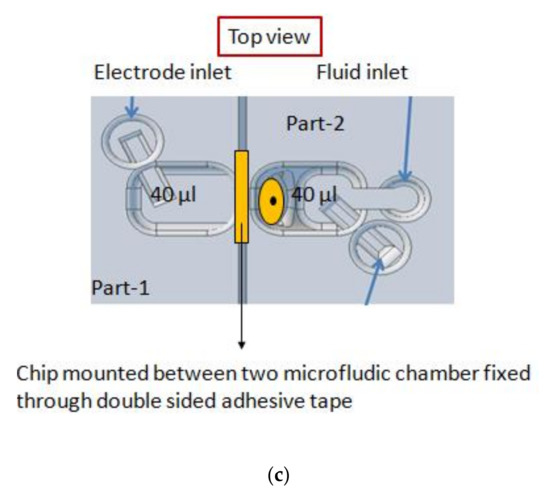 The fabrication steps of the BLM aperture were already reported in our previous work [22,45,51]. In short, a 380-µm-thick silicon double-polished wafer was introduced in a low-pressure chemical vapor deposition (LPCVD) system to obtain a 500-nm-thick silicon nitride layer. Afterwards, photolithography and reactive ion etching (RIE) was carried out to transfer the aperture and etch profile at the front and backside of the wafer. The aperture (30 µm to 100 µm) was opened by conducting KOH (30%) anisotropic wet chemical etching, where silicon was etched though. Finally, conformal Parylene coating (9.2 µm Parylene-C or 3.5 µm Parylene-AF4) was performed in a Labcoater series 300 (Plasma Parylene Systems GmbH, Rosenheim, Germany). In Figure 1a, a schematic of the processed chip is shown.