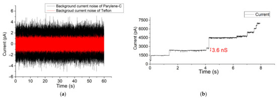 The same potential and filter settings applied over a constructed BLM in a 90 µm diameter Parylene-C-coated silicon nitride aperture resulted in a similar gating conductance value (approx. 3.3 nS) [51]. BLMs constructed in a free-standing Parylene-C-coated aperture were also stable for at least 25 min. Within the highlighted trace, the background current noise has an approximate peak-to-peak current of 7 pA (Figure 3a). This background current noise is due to the silicon substrate, which causes excess noise due to parasitic capacitances. However, this noise level is too high for typical single-channel analysis.
