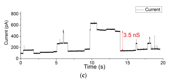 After pre-treating the Teflon aperture with n-decane and drying with nitrogen gas, a BLM was created using the pseudo-painting method (Figure 2). In Figure 3a, the maximum peak-to-peak current noise is approximately 3 pA (8-pole Bessel low-pass filtered at 1 kHz; 3-sigma accuracy [55]). Usually, a BLM is stable for more than 25 min. OmpF was introduced in the chamber located at the cis side of the BLM. Multiple gating conductance steps were observed when a 100 mV potential was applied across the membrane. In Figure 3b, the conductance step of the highlighted current step is 3.6 nS. After fusion of OmpF into the BLM (OmpF dissolved in detergent to create fusible micelles), the BLM was stable long enough to conduct gating activity recordings. The BLM used to record the OmpF gating events in Figure 3c was stable for 10 min.