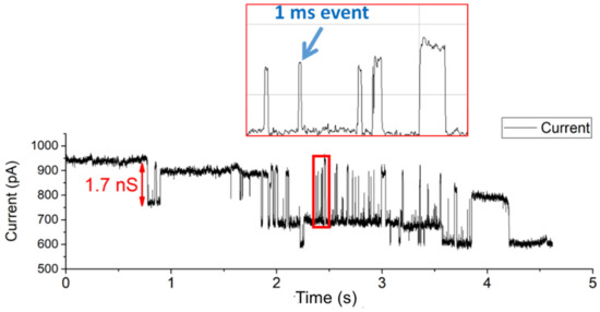 In Figure 3, the depicted voltage-induced gating events of OmpF were all longer than 100 ms. OmpF is known to also gate much faster [58]. The high SNR and ability to show short subconductance events make the conformal Parylene-C-coated apertures very suitable to investigate fast OmpF gating events (ca. 1 ms). An amount of 1 µL of a 1 mg/mL OmpF stock solution was introduced at the cis side of the BLM chamber. Within a few minutes, fast gating events of approximately 1 ms to 3 ms were clearly observed (Figure 4). The signal was recorded while setting the sampling frequency at 10 kHz and applying a 1 kHz low-pass 8-pole Bessel filter. The highlighted 1 ms event has a conductance level of 1.7 nS at 150 mV DC voltage.