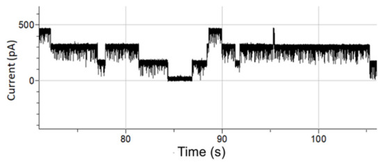 Similar measurements were conducted on a Parylene-AF4-coated system with an aperture diameter of 80 µm. Here, OMVs were introduced at the cis side of the BLM. The osmotic fusion of OMVs was stimulated by applying a symmetric buffer solution of 1 M KCl buffer. KCl was used because the electrophoretic mobility of the cation and anion are similar, so that there is no polarization. As a result, upon application of a membrane, potential multiple closing gating events of OmpF pores were observed directly after OMV–BLM fusion occurred within a few minutes. After the fusion of OMVs, the current steps (opening and closing events) of OmpF monomers were observed confirming the successful vesicle and protein incorporation in the BLM (see Figure 7a). The applied holding potential was kept at 200 mV. (In the Supplementary Materials, Figure S8c, a larger timespan of this measurement is depicted).