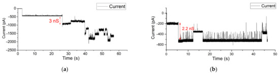 (a,b). Gating events in a Parylene-C-coated aperture of OmpF incorporated in a BLM by fusion of OMVs. The applied voltage was set to −150 mV (Additional measurements in different chambers are shown in the Supplementary Materials Figure S6).