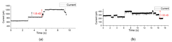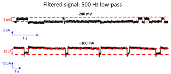 Gramicidin D (a mixture of A, B and C) is a naturally occurring peptide with antibiotic activity and is commonly used for treating various bacterial infections [61]. When two Gramicidin molecules are aligned from both sides of the bilayer, it occasionally leads to pore formation [62,63,64,65,66,67]. The low single-channel conductance levels resulting through such small pores in Gramicidin are challenging to characterize. In particular, this is because the channel-forming ability of Gramicidin depends strongly on the thickness of the lipid membrane as well as the fluidity and, thus, on the temperature. Therefore, it is often used as a standard for good bilayer formation investigations. To demonstrate the capability of the presented Parylene-coated silicon nitride aperture for small single-channel translocation investigations, Gramicidin D was added at both sides of the BLM in 2 M KCL solution. Figure 9 shows current step events with 0.5 kHz filtering of the signal. The conductance level of such pores amounts to approximately 15 pS at 200 mV and 40 pS at −300 mV. Moreover, the conductance value of the small pore is similar to the reported value found in the literature [41,68].