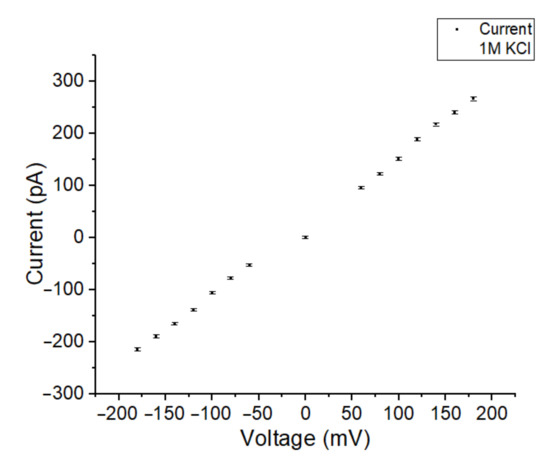 Upon successful OMV incorporation using a symmetric buffer solution, the formed BLM acts as a conductor that shows a linear relationship with the current at different holding potentials. In Figure 8, the voltage was varied between −200 mV and 200 mV.
