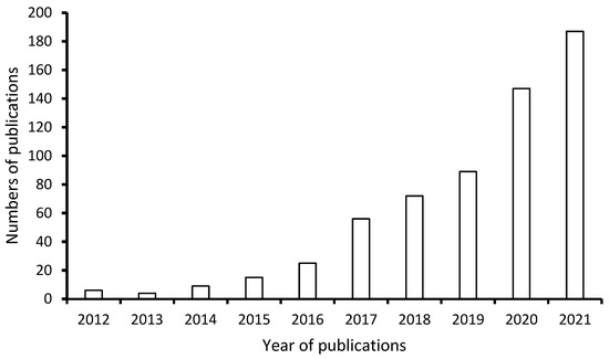 Scientific publications on nanocellulose crystal-based membranes for wastewater treatment (data extracted from www.sciencedirect.com on 14 July 2021 from Science direct, using the keywords “nanocellulose crystal”, “membrane”, and “wastewater treatment”).