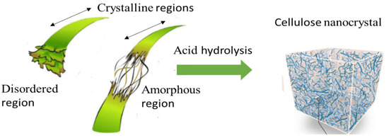 Cellulose is the most readily available and extensively distributed natural macromolecule on earth and is affordable [39]. It is a macromolecule polysaccharide that comprises D-glucose, in which the link between the glucose molecules is through β (1→4) glycosidic bonds [40]. The presence of a large number of active hydroxyl groups in the molecular chains allows the easy formation of intramolecular and inter-molecular hydrogen bonds. The β (1→4) glycosidic bonds can be broken through acid or alkali- pre-treatment and subsequently enzymolysis for CNC formation in a strongly acidic environment [41,42].