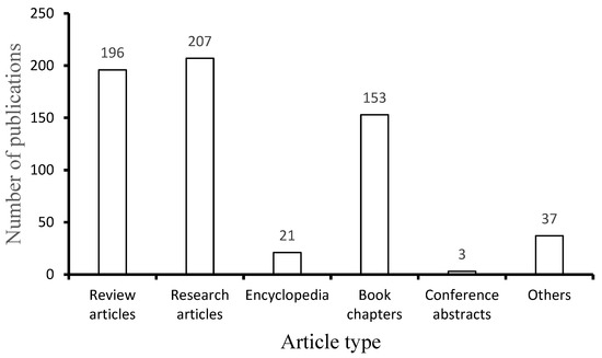 Water pollution from contaminants such as fertilizers, dyes, personal care products, pharmaceuticals, pesticides, metals, metalloids, and so on resulting from domestic, industrial, or agricultural sources poses significant environmental concerns [130,131]. These contaminants are carcinogenic, and usually end up in the water streams, and threaten all kinds of living organisms [130,131]. Hence, numerous techniques have been offered to remove such contaminants, depending on their physical and chemical properties. Cellulose nanoparticles, in particular cellulose nanocrystals (CNC), have been explored in water purification systems due to their high aspect ratio (i.e., the ratio of the length to the width of a particle), mechanical strength, high surface area, and the abundance of chemical groups on their surface, e.g., hydroxyl or carbonyl groups [80]. These functional groups assist with the adsorption of charged contaminants via electrostatic interactions. Cellulose-based materials have shown a remarkably high attraction toward particular contaminants such as metal ions and dyes [132,133,134]. Despite all of the aforementioned benefits, the major challenge in membrane development is the optimization of the balance between porosity, high permeability, and good filtration performance. Therefore, various preparation techniques such as coating, freeze-drying, hybridization, solvent casting, and electrospinning have been utilized for functional membranes [80,135,136]. Figure 8 shows the number of publications (of different types) on the application of different types of cellulose nanocrystal-based membranes in the purification of wastewater.